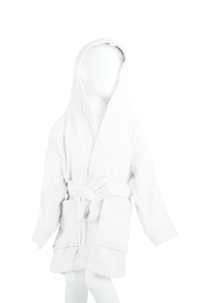 The One Towelling® kinderbadjas met Capuchon Wit. 340 gr/m². 100% gekamd katoen met luxe velours afwerking. Wasbaar tot 60 graden. Te drogen op laag temperatuur in de droogtrommel. Oeko-Tex Standard 100 gecertificeerd. Maten: 116/128, 135/150 en 152/164.