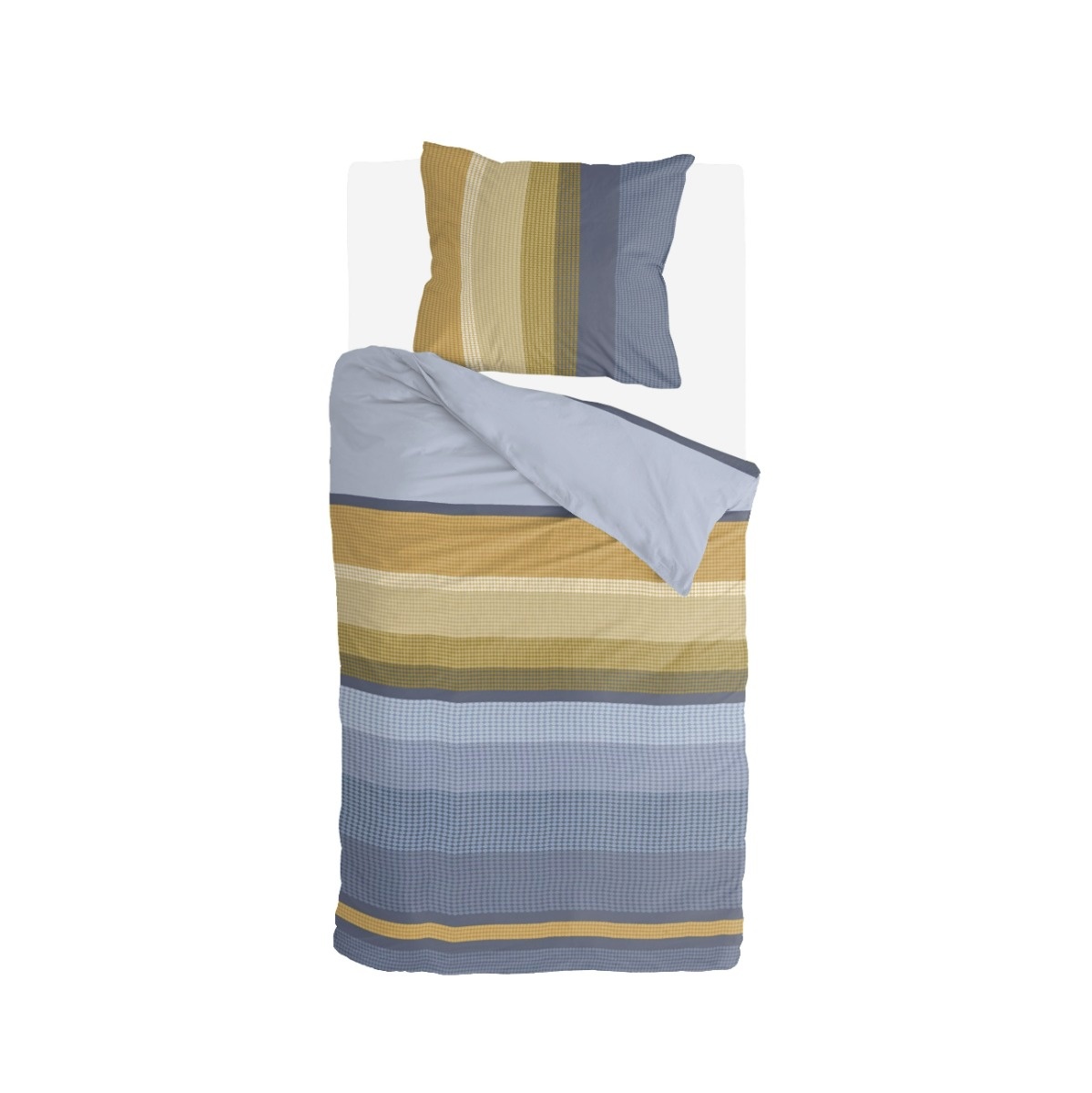 Het is alsof de zon langzaam in de zee zakt en de kleuren op dit Byrklund dekbedovertrek'Golden Stripes'terecht zijn gekomen. Een moderne twist op het klassieke streepjes patroon van vroeger. De kleurencombinatie van het diepe blauw met het prachtige okergeel geeft een mooi kleurenpalet. De strepen op het overtrek lopen horizontaal en op de kussenslopen verticaal.