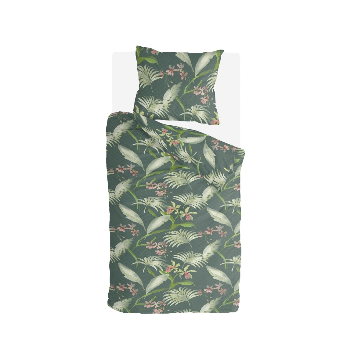 Het is een kleurrijk geheel het Byrklund dekbedovertrek'Green&Flowers'. De vrolijke roze bloemen dwarrelen over het groene dekbedovertrek. Zo haal je de natuur rechtstreeks je slaapkamer binnen. Verschillende grote bladeren verreiken het dekbedovertrek met allerlei tinten groen. Gemaakt van 100% katoen voelt comfortabel aan en is lekker luchtig.