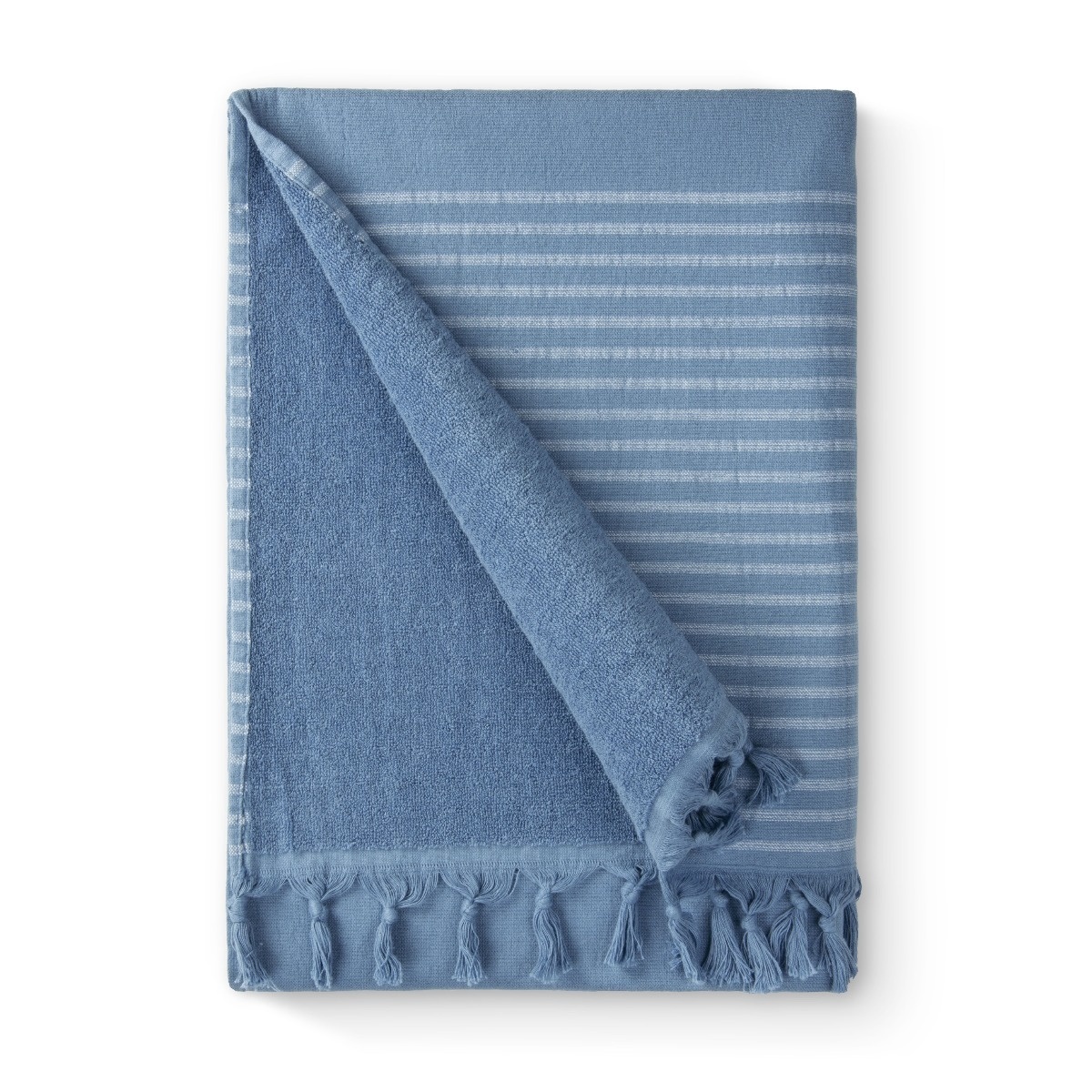 Deze hamamdoek is perfect voor een dagje sauna het strand of gewoon heerlijk voor thuis. Door de fijne afmetingen wikkel je hem gemakkelijk om je lichaam. De hamamdoek heeft aan de uiteinden een streepmotief een badstof binnenkant en is afgewerkt met vrolijke franjes. Daarnaast is deze hamamdoek makkelijk om mee te nemen door het dunne maar stevige materiaal waardoor deze weinig ruimte in neemt. Een fijne basic die bij iedereen in de kast zou moeten liggen. Materiaal 100% katoen afmetingen 100x180 cm.