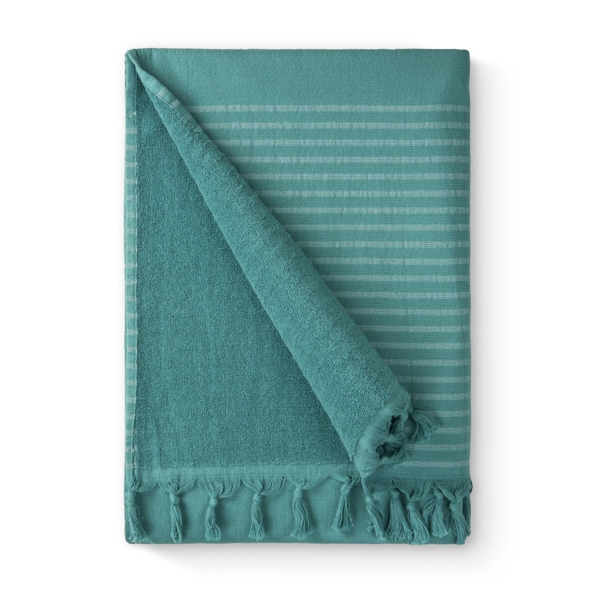 Deze hamamdoek is perfect voor een dagje sauna het strand of gewoon heerlijk voor thuis. Door de fijne afmetingen wikkel je hem gemakkelijk om je lichaam. De hamamdoek heeft aan de uiteinden een streepmotief een badstof binnenkant en is afgewerkt met vrolijke franjes. Daarnaast is deze hamamdoek makkelijk om mee te nemen door het dunne maar stevige materiaal waardoor deze weinig ruimte in neemt. Een fijne basic die bij iedereen in de kast zou moeten liggen. Materiaal 100% katoen afmetingen 100x180 cm.