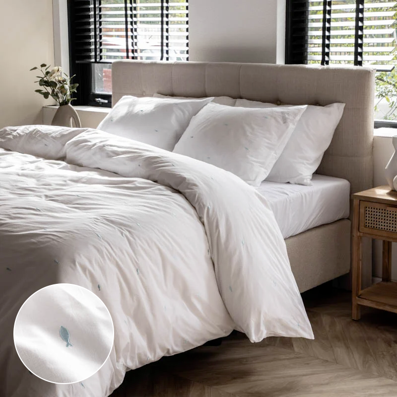 Een effen dekbedovertrek met een minimalistische print van geborduurde blauwe vissen. Het overtrek wordt geleverd met bijpassende kussenslopen voor een prachtige complete set. Materiaal Dit prachtige dekbedovertrek is gemaakt van 100% katoen. Door het gebruik van dit materiaal is de overtrekset ademend, stevig, vochtregulerend en erg zacht. Al deze eigenschappen dragen bij aan een goede nachtrust. Maten 1-persoons (140 x 240 + 1 kussensloop) 2-persoons (200 x 240 + 2 kussenslopen) Lits-jumeaux (240 x 240 + 2 kussenslopen) Instopstrook Dit dekbedovertrek is voorzien van een zogeheten dubbele doorlopende instopstrook en heeft een totale lengte van 240 centimeter. Hierdoor houd je altijd voldoende stof over om je dekbedovertrek stevig in te stoppen aan de onderzijde - óók wanneer je een extra lang dekbed gebruikt of op een wat hoger matras slaapt. Zeg maar dag tegen koude voeten! Wasvoorschrift Wasbaar op 60 °C, eerste twee keer op 40 °C wassen en niet in de droger doen. 3 keer separaat wassen. Matig heet strijken. Drogen in een droogtrommel op een licht programma. Niet met bleekmiddel behandelen. - Bestel nu op Dekbed-Discounter.nl
