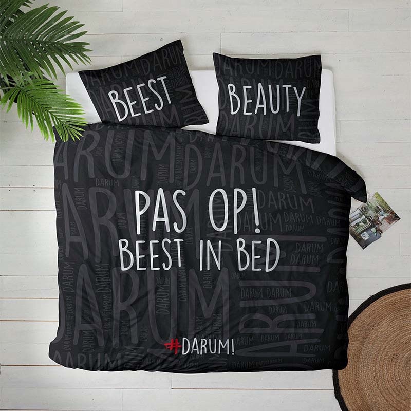 Nieuwste collectie dekbedovertrekken in samenwerking met #DARUM PAS OP! Beest in Bed! Is dit een quote waar jij je wel in kan vinden? Slaap jij als Belle of meer als het beest? Hoe je ook slaapt dit dekbedovertrek is perfect voor jou! Het overtrek wordt geleverd met bijpassende kussenslopen voor een prachtige complete set. Materiaal Dit prachtige dekbedovertrek is gemaakt van 80% polyester & 20% katoen. Door het gebruik van dit materiaal is de overtrekset kreukherstellend, licht van gewicht en valt deze soepel om je heen. Al deze eigenschappen dragen bij aan een goede nachtrust. Maten 1-persoons (140 x 200/220 + 1 kussensloop) 2-persoons (200 x 200/220 + 2 kussenslopen) Lits-jumeaux (240 x 200/220 + 2 kussenslopen) Instopstrook Dit dekbedovertrek heeft over de gehele breedte een dubbele instopstrook inclusief drukknopen. #DARUM! Trendy en modern en grappig!; dat is waar #DARUM! voor staat. Met de grappige teksten van #DARUM!, zul je altijd een geweldige eyecatcher hebben in je slaapkamer! De print blijft wasbeurt na wasbeurt haarscherp en zal er dankzij de diversiteit van de prints altijd een overtrek bij zitten dat perfect bij jou en je slaapkamer past. Meer #DARUM! artikelen? www.darum.nl - Bestel nu op Dekbed-Discounter.nl