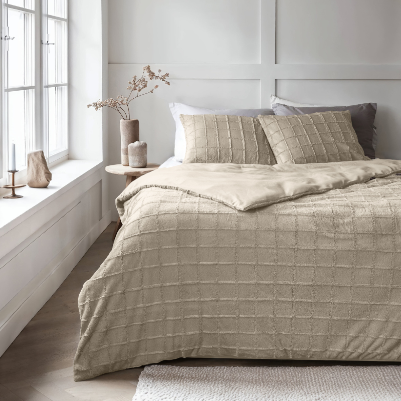 Dekbedovertrek Faux Fur Check - Luxueuze Warmte voor Jouw Slaapkamer Omhul jezelf in pure luxe met het Sleeptime Dekbedovertrek Faux Fur Check in prachtig beige. Deze heerlijk zachte teddy kwaliteit brengt warmte en stijl naar je slaapkamer. Belangrijkste kenmerken: De bovenzijde van dit product is vervaardigd uit 100% microvezel imitatie bont met een elegante schelpenstructuur, terwijl de onderzijde is gemaakt van zachte 100% microvezel. De kussenslopen zijn voorzien van een praktische hotelsluiting, wat bijdraagt aan het gebruiksgemak. Het anti-allergische materiaal is ideaal voor de gevoelige huid en zorgt voor een comfortabele ervaring. Bovendien is het product kreuk- en strijkvrij, wat moeiteloos gebruik mogelijk maakt. Met een totale lengte van 220 cm en handige drukknopen is het ontworpen voor optimaal gemak. Het geheel is geproduceerd met gecertificeerde stoffen, wat de kwaliteit en duurzaamheid waarborgt. Trendy comfort in je slaapkamer Teddy is momenteel helemaal de trend en je ziet deze stijl overal terug in kleding en meubels. Met dit Faux Fur Check dekbedovertrek van Sleeptime haal je deze luxueuze trend direct in je slaapkamer. De zachte imitatie bont bovenzijde met de unieke schelpen structuur geeft je bed een rijke uitstraling, terwijl het tegelijkertijd heerlijk aanvoelt tegen je huid. Praktisch in gebruik Naast de luxueuze uitstraling is dit dekbedovertrek ook nog eens bijzonder praktisch. Het materiaal is kreuk- en strijkvrij, waardoor je bed er altijd verzorgd uitziet zonder extra moeite. Je kunt het overtrek op 40 graden wassen en het is zelfs geschikt voor de droger. De kussenslopen zijn voorzien van een hotelsluiting die ervoor zorgt dat je kussens netjes op hun plek blijven. Gezond slapen Het anti-allergische materiaal maakt dit dekbedovertrek geschikt voor iedereen, ook als je een gevoelige huid hebt. De microvezel is zacht voor je huid en zorgt voor een comfortabele nachtrust. Bovendien is het overtrek geproduceerd met gecertificeerde stoffen, wat betekent dat je kunt vertrouwen op de kwaliteit en veiligheid van het product. Transformeer je slaapkamer vandaag nog met dit stijlvolle Dekbedovertrek Faux Fur Check en ervaar het ultieme comfort. Geniet van warme, knusse nachten in een bed dat niet alleen heerlijk aanvoelt maar er ook nog eens prachtig uitziet! - Bestel nu op Dekbed-Discounter.nl