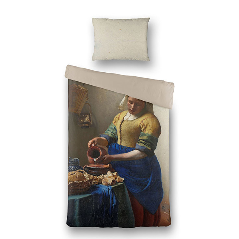 Het melkmeisje, ook wel De keuken- of melkmeid genoemd, is een schilderij van de Hollandse meester Johannes Vermeer uit circa 1660. Op dit prachtige dekbedovertrek is een haarscherpe print afgedrukt van dit prachtige schilderij. Zo lijkt je slaapkamer op een luxe museum. Dit katoen-satijnen dekbedovertrek is heel soepel, 'kraakt' iets minder dan gewone katoen en voelt zacht en glad aan. Katoen satijn slaapt iets warmer dan een gewone katoen, dit komt doordat het dichter op elkaar geweven werd. Het overtrek wordt geleverd met bijpassende kussenslopen voor een prachtige complete set. Materiaal Dit prachtige dekbedovertrek is gemaakt van 100% Katoen-Satijn. Deze katoensoort heeft een speciale weving ondergaan waardoor het overtrek zachter en gladder aanvoelt dan een normaal katoenen overtrek; dit wordt satijn genoemd. Bovendien blijven de kleuren op katoen-satijn langer mooi en heeft je overtrek een chique glans. Ook is het overtrek ademend en valt het lekker soepel om je heen. Al deze eigenschappen dragen bij aan een goede nachtrust. Maten 1-persoons (140 x 200/220 + 1 kussensloop) 2-persoons (200 x 200/220 + 2 kussenslopen) Lits-jumeaux (240 x 200/220 + 2 kussenslopen) Instopstrook Dit dekbedovertrek is voorzien van een zogeheten dubbele doorlopende instopstrook en heeft een totale lengte van 240 centimeter. Hierdoor houd je altijd voldoende stof over om je dekbedovertrek stevig in te stoppen aan de onderzijde - óók wanneer je een extra lang dekbed gebruikt of op een wat hoger matras slaapt. Zeg maar dag tegen koude voeten! Wasvoorschrift Wasbaar op 40 °C. Matig heet strijken, tot 150 °C. Drogen in een droogtrommel op een licht programma. Niet met bleekmiddel behandelen. Cloud Nine Cloud Nine is daadwerkelijk een prachtig merk. Het merk produceert hoge kwaliteit voor een eerlijke prijs. Zo kan iedereen, met een grote of kleine portemonnee, heerlijk genieten van een welverdiende nachtrust. Daarnaast is Cloud Nine exclusief bij Dekbed-Discounter te vinden! Door hun uiteenlopende dessins zit er voor iedereen een leuke print tussen. - Bestel nu op Dekbed-Discounter.nl
