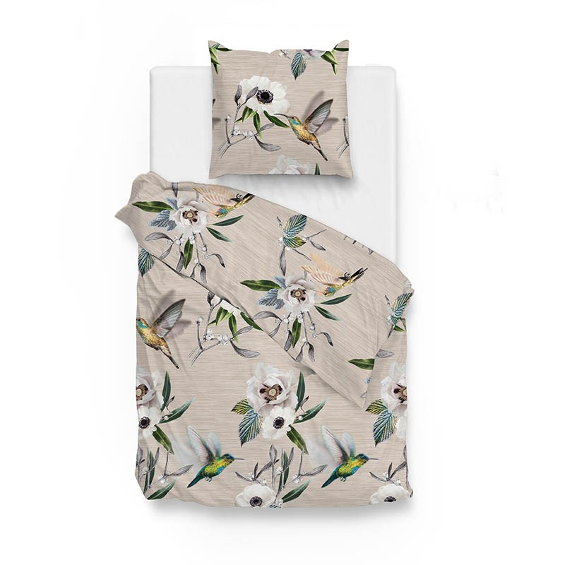 Dekbedovertrek Jun heeft een beige gemêleerde print. Op het overtrek staan kolibries en witte bloemen afgebeeld. Het overtrek wordt geleverd met bijpassende kussenslopen voor een prachtige complete set. Materiaal Dit prachtige dekbedovertrek is gemaakt van 100% katoen. Door het gebruik van dit materiaal is de overtrekset ademend, stevig, vochtregulerend en erg zacht. Al deze eigenschappen dragen bij aan een goede nachtrust. Maten 1-persoons (140 x 200/220 + 1 kussensloop) 2-persoons (200 x 200/220 + 2 kussenslopen) Lits-jumeaux (240 x 200/220 + 2 kussenslopen) Lits-jumeaux XL (260 x 200/220 + 2 kussenslopen) Instopstrook Dit dekbedovertrek is voorzien van een zogeheten dubbele doorlopende instopstrook en heeft een totale lengte van 220 centimeter. Hierdoor houd je altijd voldoende stof over om je dekbedovertrek stevig in te stoppen aan de onderzijde - óók wanneer je een extra lang dekbed gebruikt of op een wat hoger matras slaapt. Zeg maar dag tegen koude voeten! Wasvoorschrift Wasbaar op 40 °C. Matig heet strijken, tot 150 °C. Drogen in een droogtrommel op een licht programma. Niet met bleekmiddel behandelen. - Bestel nu op Dekbed-Discounter.nl