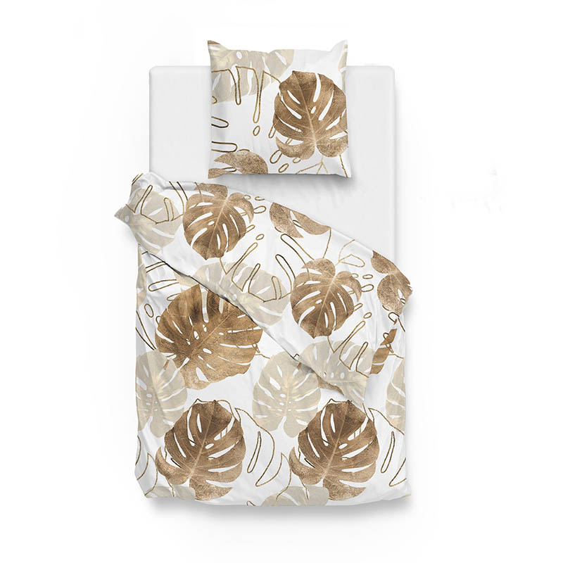 Dekbedovertrek Mimi heeft een print met bladeren van de Monstera plant. Op het overtrek zijn bruine bladeren, lichtbruine bladeren, en alleen omlijningen van de bladeren zichtbaar. Het overtrek wordt geleverd met bijpassende kussenslopen voor een prachtige complete set. Materiaal Dit prachtige dekbedovertrek is gemaakt van 100% katoen. Door het gebruik van dit materiaal is de overtrekset ademend, stevig, vochtregulerend en erg zacht. Al deze eigenschappen dragen bij aan een goede nachtrust. Maten 1-persoons (140 x 200/220 + 1 kussensloop) 2-persoons (200 x 200/220 + 2 kussenslopen) Lits-jumeaux (240 x 200/220 + 2 kussenslopen) Lits-jumeaux XL (260 x 200/220 + 2 kussenslopen) Instopstrook Dit dekbedovertrek is voorzien van een zogeheten dubbele doorlopende instopstrook en heeft een totale lengte van 220 centimeter. Hierdoor houd je altijd voldoende stof over om je dekbedovertrek stevig in te stoppen aan de onderzijde - óók wanneer je een extra lang dekbed gebruikt of op een wat hoger matras slaapt. Zeg maar dag tegen koude voeten! Wasvoorschrift Wasbaar op 40 °C. Matig heet strijken, tot 150 °C. Drogen in een droogtrommel op een licht programma. Niet met bleekmiddel behandelen. - Bestel nu op Dekbed-Discounter.nl