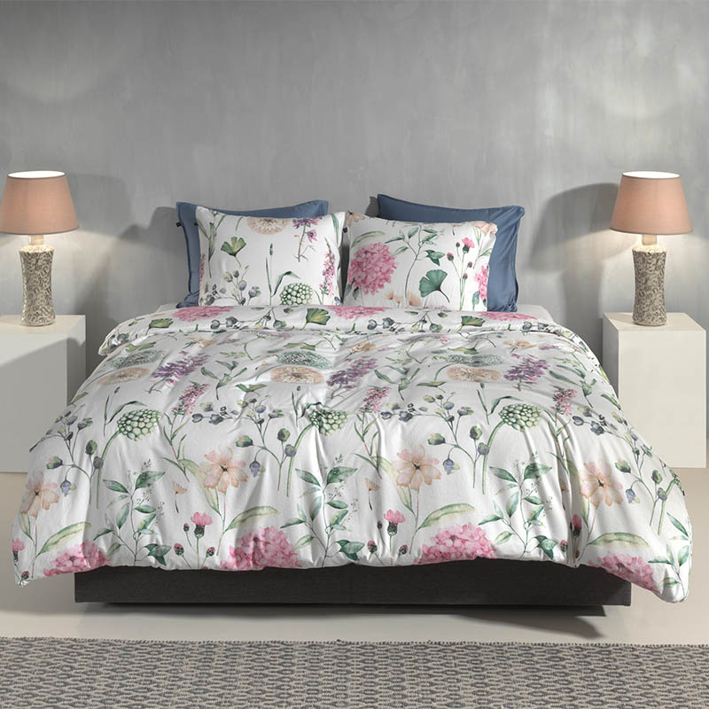 Fleur jouw slaapkamer op met het bloemige dekbedovertrek Nessa. Op het witte overtrek staan vrolijke roze en paarse bloemen afgebeeld. Het overtrek wordt geleverd met bijpassende kussenslopen voor een prachtige complete set. Materiaal Dit dekbedovertrek is gemaakt van 100% hoogwaardig katoen-flanel. Deze stof is licht opgeruwd, waardoor het een dun zacht laagje krijgt. Dit houdt je heerlijk warm. Daarnaast heeft het de fijne eigenschappen van 'normaal' katoen. Het materiaal is namelijk ook ademend en vochtabsorberend. Maten 1-persoons (140 x 200/220 + 1 kussensloop) 2-persoons (200 x 200/220 + 2 kussenslopen) Lits-jumeaux (240 x 200/220 + 2 kussenslopen) Lits-jumeaux XL (260 x 200/220 + 2 kussenslopen) Instopstrook Dit dekbedovertrek is voorzien van een zogeheten dubbele doorlopende instopstrook en heeft een totale lengte van 220 centimeter. Hierdoor houd je altijd voldoende stof over om je dekbedovertrek stevig in te stoppen aan de onderzijde - óók wanneer je een extra lang dekbed gebruikt of op een wat hoger matras slaapt. Zeg maar dag tegen koude voeten! Wasvoorschrift Wasbaar op 60 °C, eerste twee keer op 40 °C wassen en niet in de droger doen. Matig heet strijken. Drogen in een droogtrommel op een licht programma. Niet met bleekmiddel behandelen. - Bestel nu op Dekbed-Discounter.nl