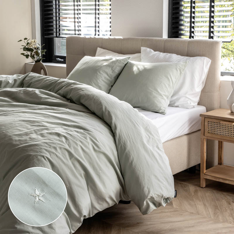 Een effen dekbedovertrek met een minimalistische print van geborduurde witte sterretjes. Het overtrek wordt geleverd met bijpassende kussenslopen voor een prachtige complete set. Materiaal Dit prachtige dekbedovertrek is gemaakt van 100% katoen. Door het gebruik van dit materiaal is de overtrekset ademend, stevig, vochtregulerend en erg zacht. Al deze eigenschappen dragen bij aan een goede nachtrust. Maten 1-persoons (140 x 240 + 1 kussensloop) 2-persoons (200 x 240 + 2 kussenslopen) Lits-jumeaux (240 x 240 + 2 kussenslopen) Instopstrook Dit dekbedovertrek is voorzien van een zogeheten dubbele doorlopende instopstrook en heeft een totale lengte van 240 centimeter. Hierdoor houd je altijd voldoende stof over om je dekbedovertrek stevig in te stoppen aan de onderzijde - óók wanneer je een extra lang dekbed gebruikt of op een wat hoger matras slaapt. Zeg maar dag tegen koude voeten! Wasvoorschrift Wasbaar op 60 °C, eerste twee keer op 40 °C wassen en niet in de droger doen. 3 keer separaat wassen. Matig heet strijken. Drogen in een droogtrommel op een licht programma. Niet met bleekmiddel behandelen. - Bestel nu op Dekbed-Discounter.nl