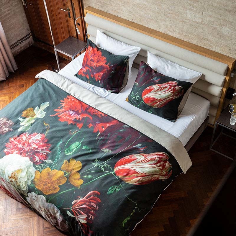 Stilleven met Bloemen is een schilderij van Nederlandse kunstschilder Jan Davidsz. de Heem. Op het schilderij zie je een stilleven met bloemen in een glazen vaas op een stenen blad. Dit is één van zijn meest bekende schilderijen. Op dit prachtige dekbedovertrek is een haarscherpe print afgedrukt van dit prachtige schilderij. Zo lijkt je slaapkamer op een luxe museum. Het overtrek wordt geleverd met bijpassende kussenslopen voor een prachtige complete set. Materiaal Dit prachtige dekbedovertrek is gemaakt van 100% Katoen-Satijn. Deze katoensoort heeft een speciale weving ondergaan waardoor het overtrek zachter en gladder aanvoelt dan een normaal katoenen overtrek; dit wordt satijn genoemd. Bovendien blijven de kleuren op katoen-satijn langer mooi en heeft je overtrek een chique glans. Ook is het overtrek ademend en valt het lekker soepel om je heen. Al deze eigenschappen dragen bij aan een goede nachtrust. Maten: 1-persoons (140 x 200/220 + 1 kussensloop) 2-persoons (200 x 200/220 + 2 kussenslopen) Lits-jumeaux (240 x 200/220 + 2 kussenslopen) Instopstrook: Dit dekbedovertrek is voorzien van een zogeheten dubbele doorlopende instopstrook en heeft een totale lengte van 240 centimeter. Hierdoor houd je altijd voldoende stof over om je dekbedovertrek stevig in te stoppen aan de onderzijde - óók wanneer je een extra lang dekbed gebruikt of op een wat hoger matras slaapt. Zeg maar dag tegen koude voeten! Wasvoorschrift: Wasbaar op 40 °C. Matig heet strijken, tot 150 °C. Drogen in een droogtrommel op een licht programma. Niet met bleekmiddel behandelen. Cloud Nine Cloud Nine is daadwerkelijk een prachtig merk. Het merk produceert hoge kwaliteit voor een eerlijke prijs. Zo kan iedereen, met een grote of kleine portemonnee, heerlijk genieten van een welverdiende nachtrust. Daarnaast is Cloud Nine exclusief bij Dekbed-Discounter te vinden! Door hun uiteenlopende dessins zit er voor iedereen een leuke print tussen. - Bestel nu op Dekbed-Discounter.nl