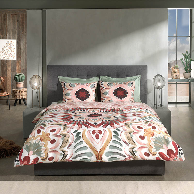 Heerlijk comfortabel en voorzien van een prachtige print aan beide zijden. Met dekbedovertrek Thelma val je altijd lekker in slaap! Het overtrek wordt geleverd met bijpassende kussenslopen voor een prachtige complete set. Materiaal is vervaardigd uit 100% katoen met Dobby-binding. Dobby-katoen is op een speciale manier geweven, hierdoor een stevige stof met prachtig weefpatroon die tegelijkertijd superzacht aanvoelt. Katoen-dobby is ventilerend en vochtabsorberend. Maten 1-persoons (140 x 200/220 + 1 kussensloop) 2-persoons (200 x 200/220 + 2 kussenslopen) Lits-jumeaux (240 x 200/220 + 2 kussenslopen) Lits-jumeaux XL (260 x 200/220 + 2 kussenslopen) Instopstrook Dit dekbedovertrek is voorzien van een zogeheten dubbele doorlopende instopstrook en heeft een totale lengte van 220 centimeter. Hierdoor houd je altijd voldoende stof over om je dekbedovertrek stevig in te stoppen aan de onderzijde - óók wanneer je een extra lang dekbed gebruikt of op een wat hoger matras slaapt. Zeg maar dag tegen koude voeten! Wasvoorschrift Wasbaar op 60 °C. Matig heet strijken. Drogen in een droogtrommel op een licht programma. Niet met bleekmiddel behandelen. - Bestel nu op Dekbed-Discounter.nl
